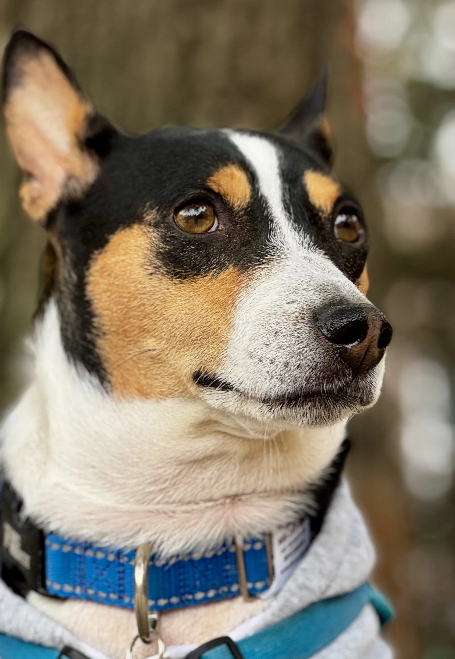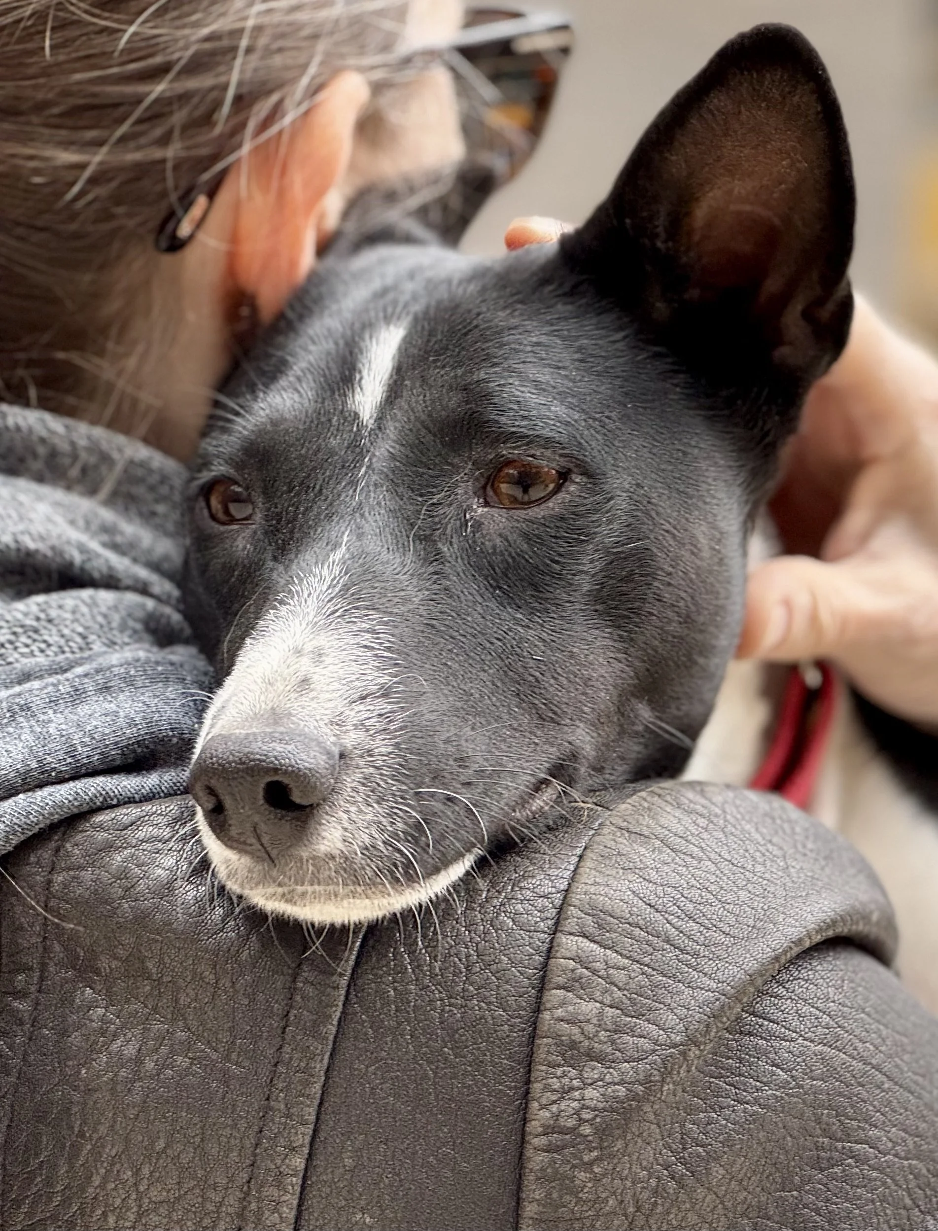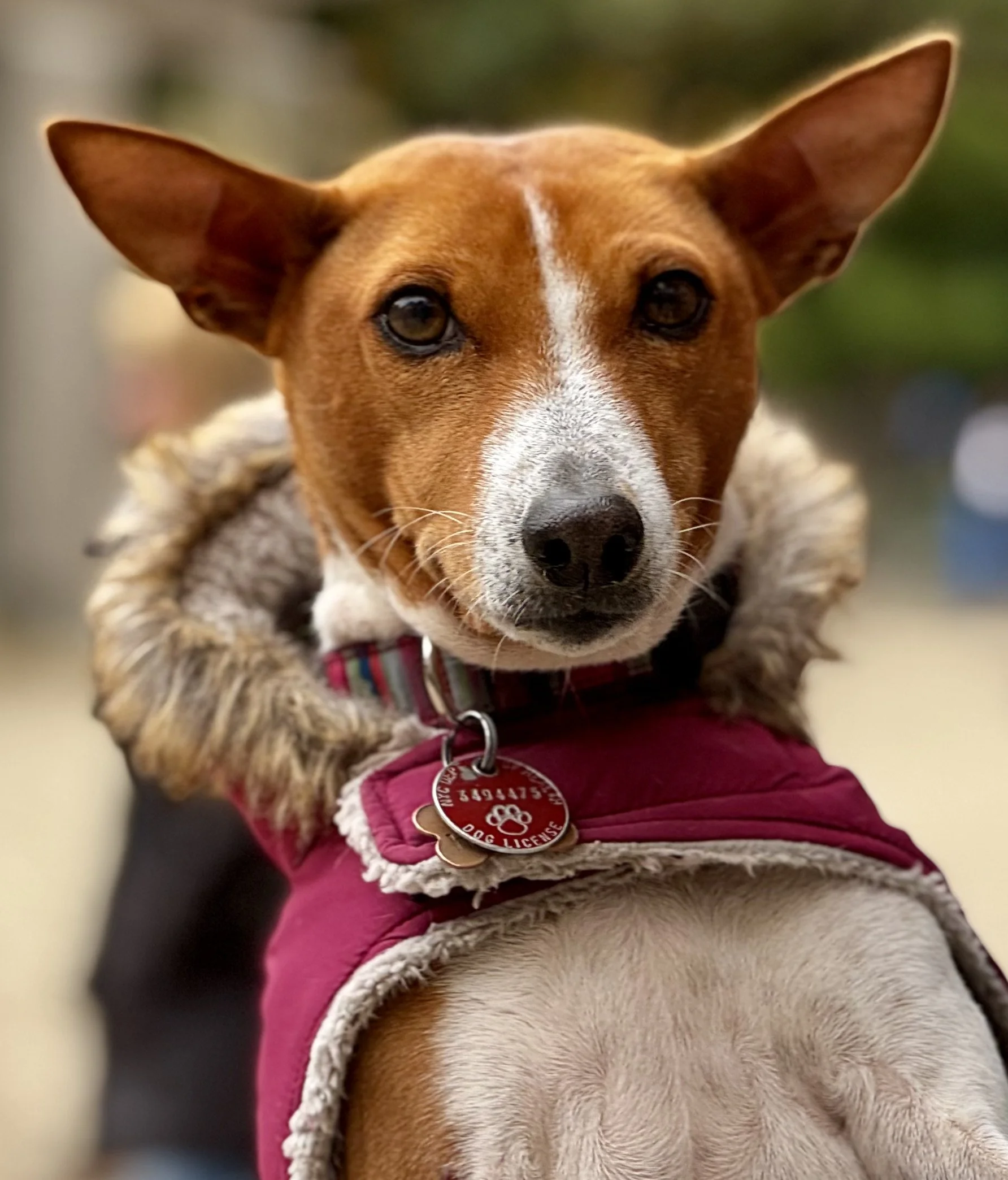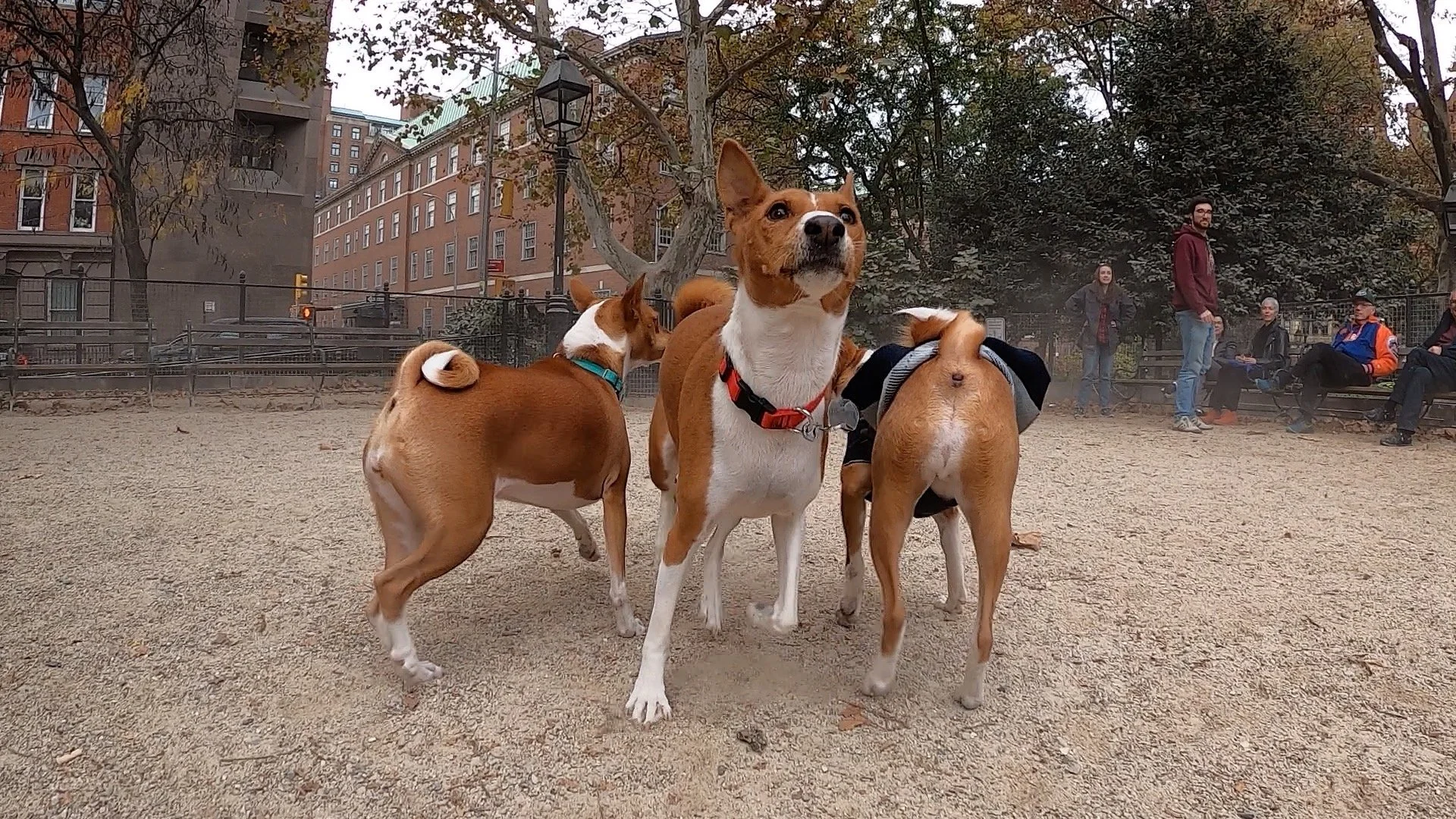 Seven basenjis gathered on a hesitantly sunny autumn morning in Washington Square Park in New York City. All dogs had some role in the tussling action, even the senior one, Harper (female, eleven-years-old.) She engaged with the youngest, Bella Luna (female, yearling.) Bella Luna then faced off with Hudson (male, two-years-old.) Kepler (male, ten-years-old,) had a brief dance with Phoebe (female, four-years-old.) Dante (male, six-years-old,) stood watch and ran, while Mia (female, seven-years-old,) ran and ran. Several dogs enjoying the petting. Starting temperature: 53°F|11°C Event: New York City Basenji Meetup - 10 November 2024.