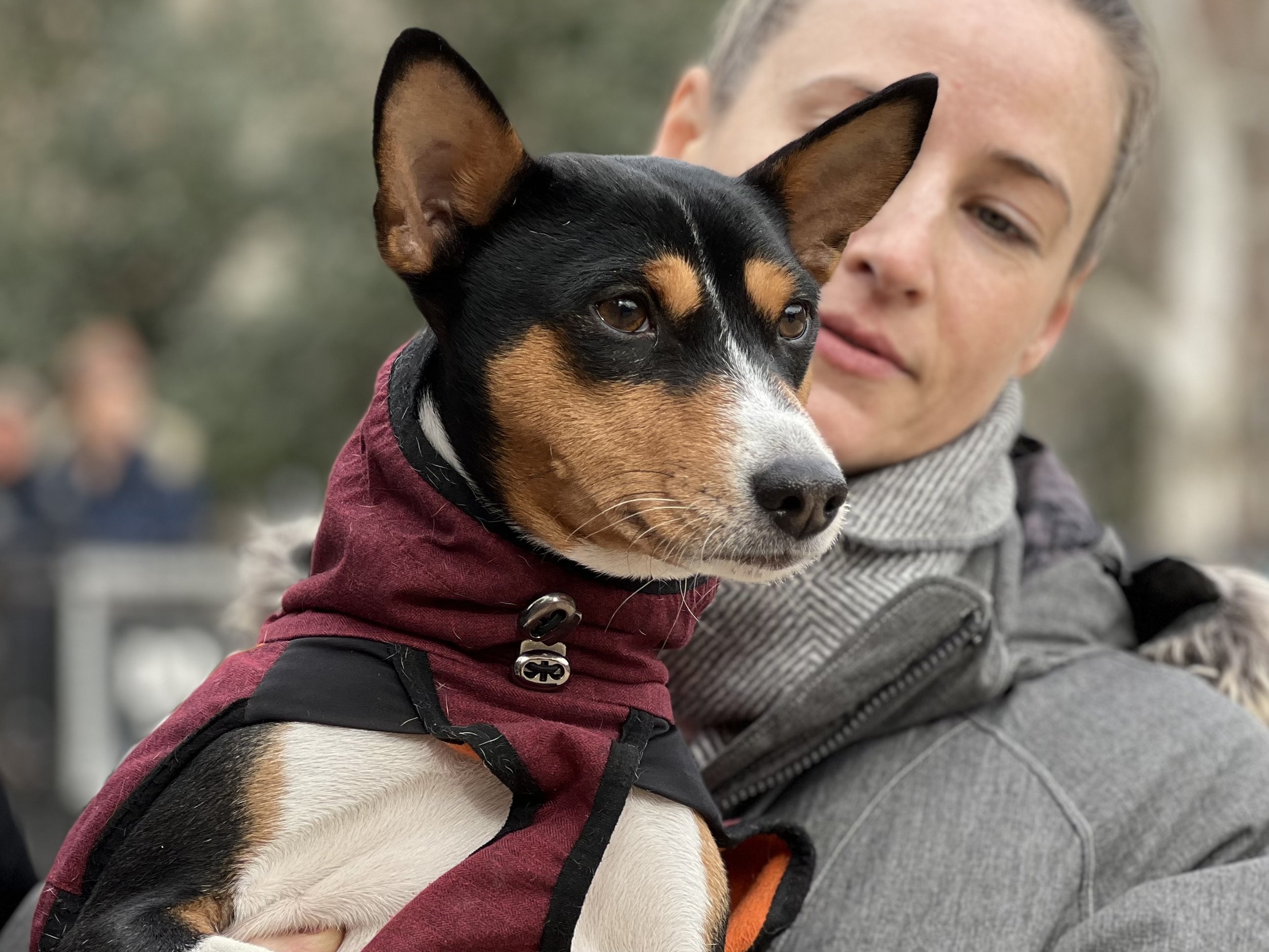 Apologies for my “Fox” faux pas. The recent puppy arrival is actually named Fawkes (male, eleven-months-old.) He was one of today’s sparkplugs along with Ella (female, two-years-old,) Benji (male, three-years-old,) Dexter (male, three-years-old,) and Lulu [listen to her barks!] (female, three-years-old.) They were the youngsters of the ten basenjis gathered on a brisk February morning in New York City’s Washington Square Park. The older adults were Dante (male, five-years-old,) Scout (female, six-years-old,) Calla (female, eight-years-old,) Malcolm (male, eight-years-old,) and Kepler (male, eight-years-old.) Starting temperature: 41°F|5°C