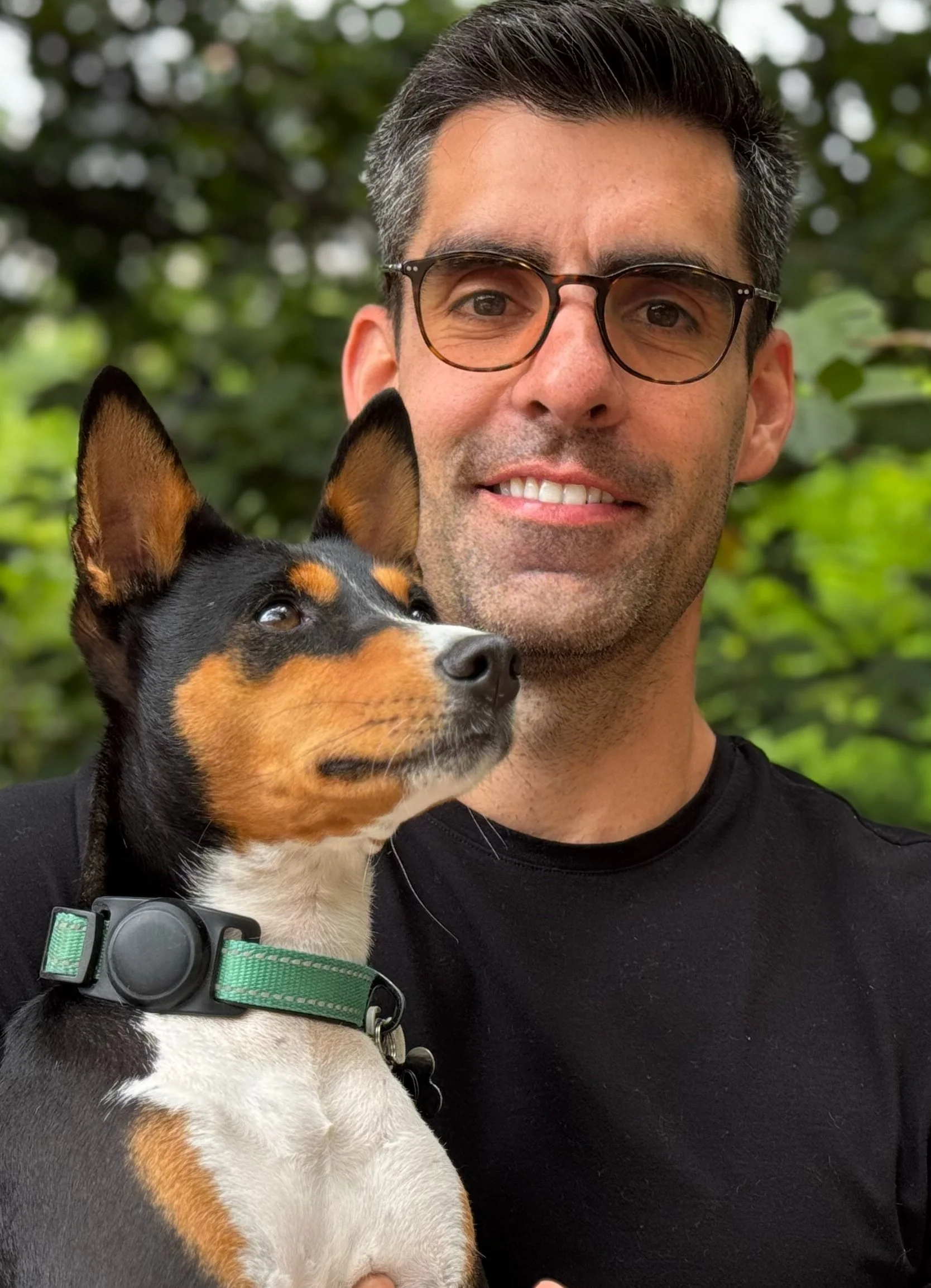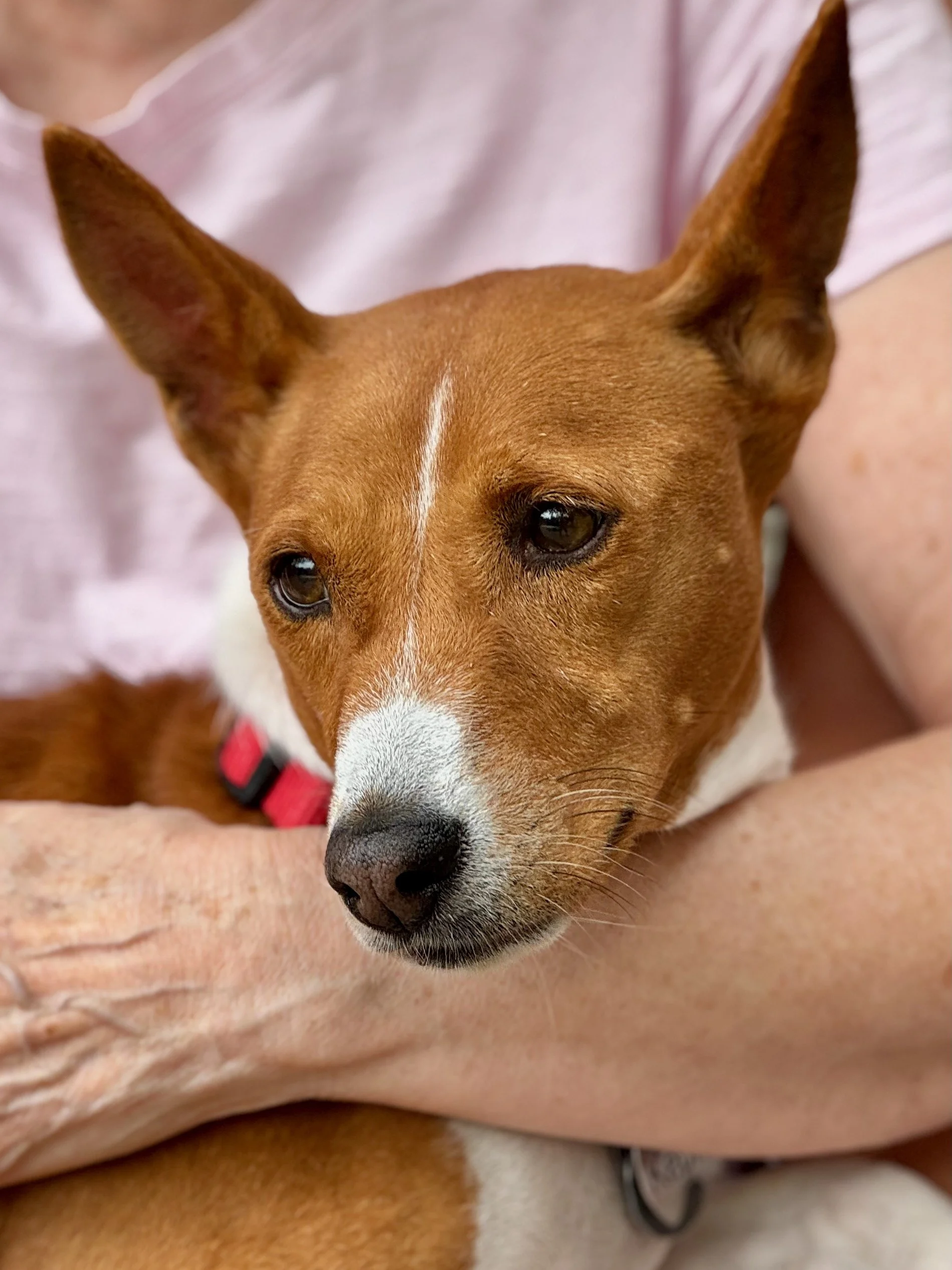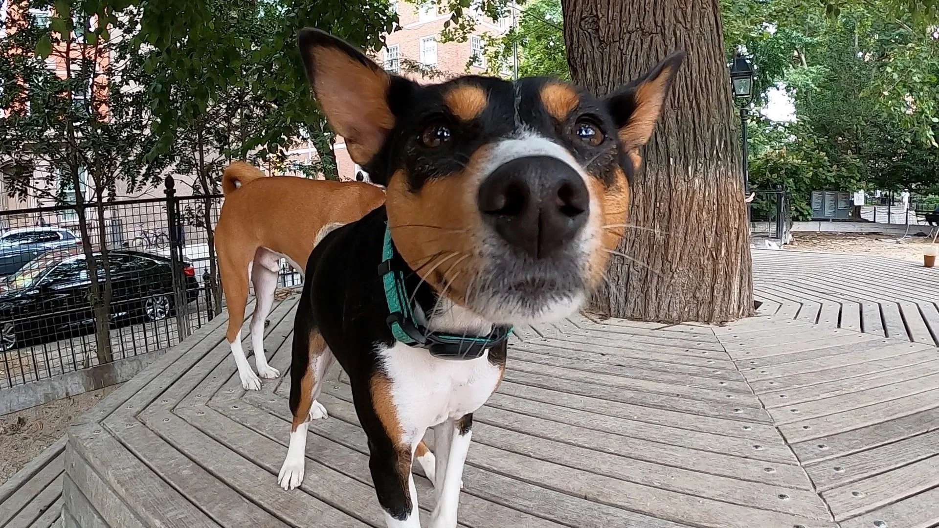 Four-year-old male Leo made his first appearance with six veteran basenjis gathered on a humid July morning in Washington Square Park in New York City. He was joined by veterans Bella Luna (female, two-years-old,) Xena (female, six-years-old,) Rocket (male, seven-years-old,) Mia (female, eight-years-old,) Scout (female, eight-years-old,) and Kepler (male, ten-years-old.) Event: New York City Basenji Meetup - 13 July 2025. Starting temperature: 75°F|24°C