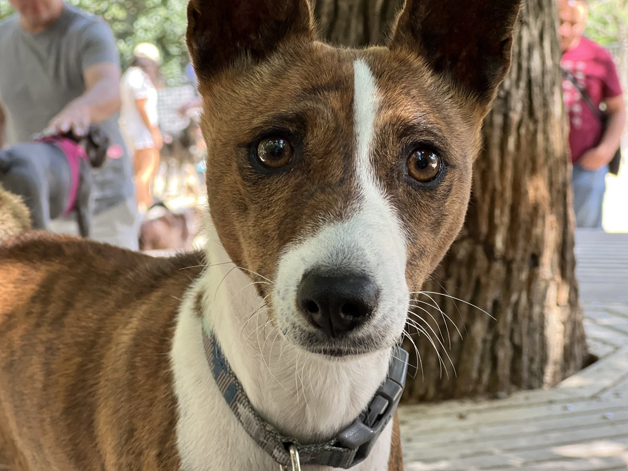 A beautiful morning with a break in the hot summer heat brought out fourteen basenjis and their humans for a run in Washington Square Park in New York City. Premiering today was Roo (female, eight-months-old.) She was joined by thirteen dogs including the hopping Dante and the flirting Mia. The dogs were puppy Kobe (male, eight-months-old,) and yearlings G.G. (female,) and Uni (female.) The young adults were five two-year-olds: Astor (male,) Dante (male,) Dexter (male,) Lulu (female,) and Zuri (female.) The adults were Zion (male, three-years-old,) Althea (female, four-years-old,) Mia (female, five-years-old,) Calla (female, seven-years-old,) and Kepler (male, eight-years-old.) Starting temperature: 75°F|23.9°C
