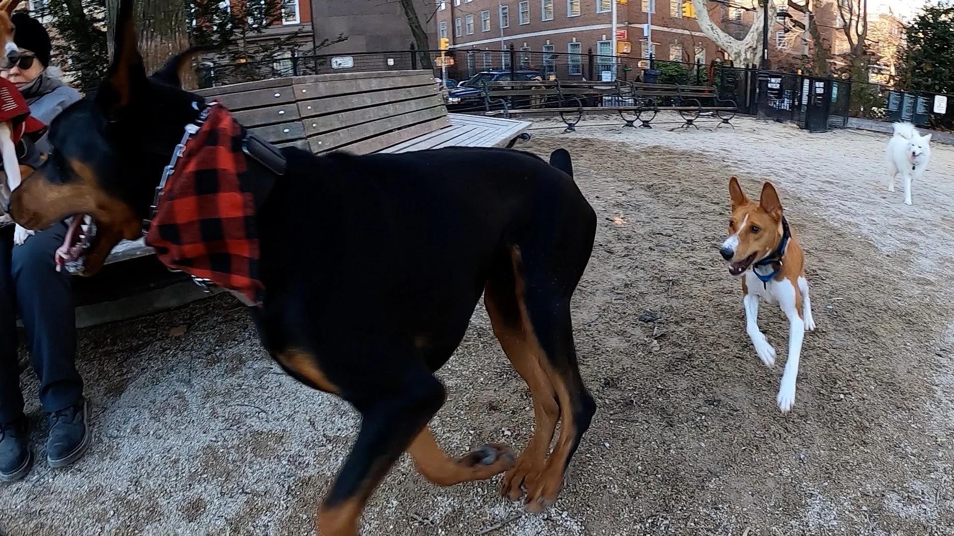Two basenjis gathered on a cold, windy day in Washington Square Park in New York City. Leading most of the action was Bruno (male, three-years-old.) He was joined by host Kepler (male, nine-years-old.) Starting temperature: 37°F|2.8°C