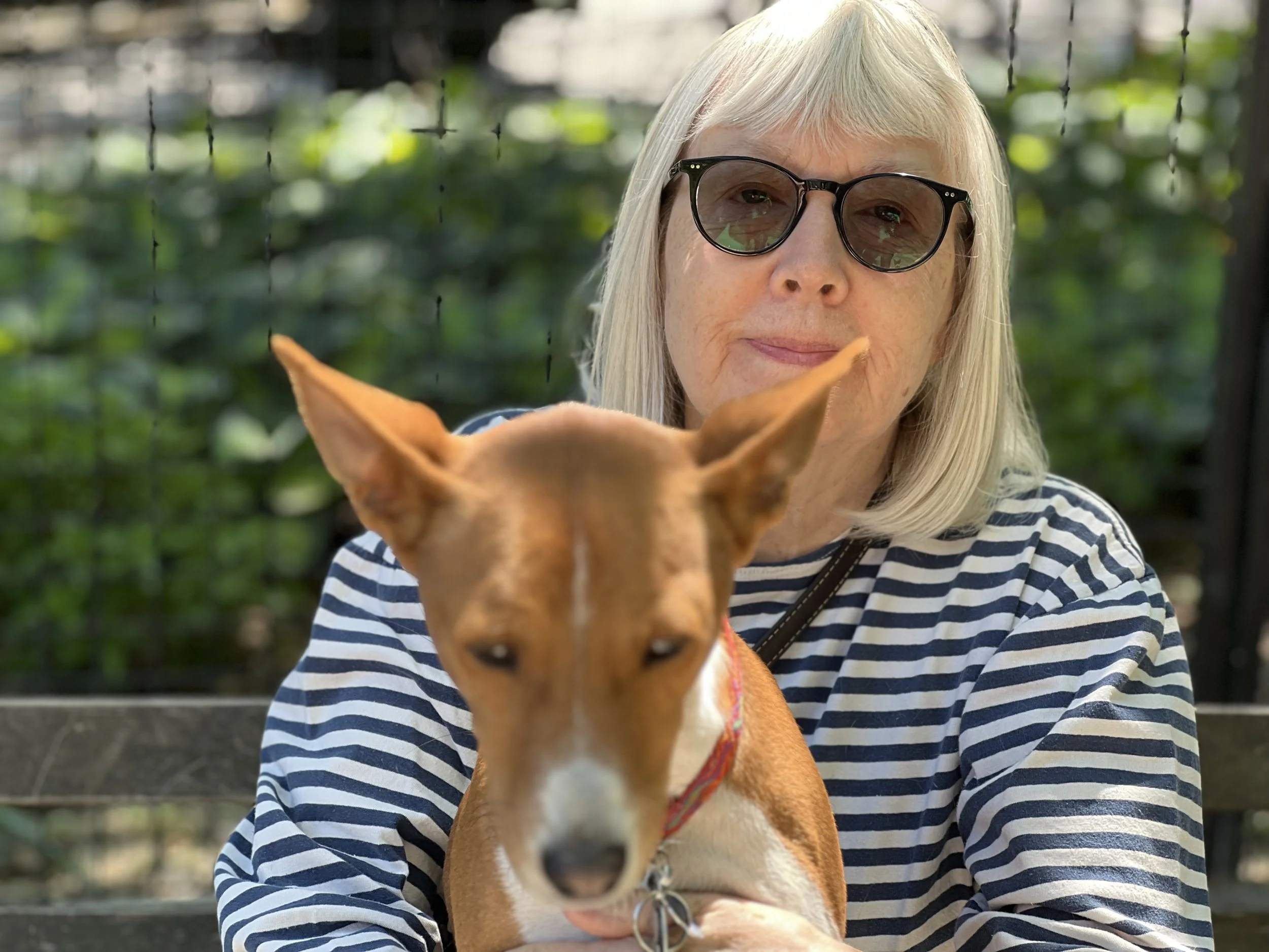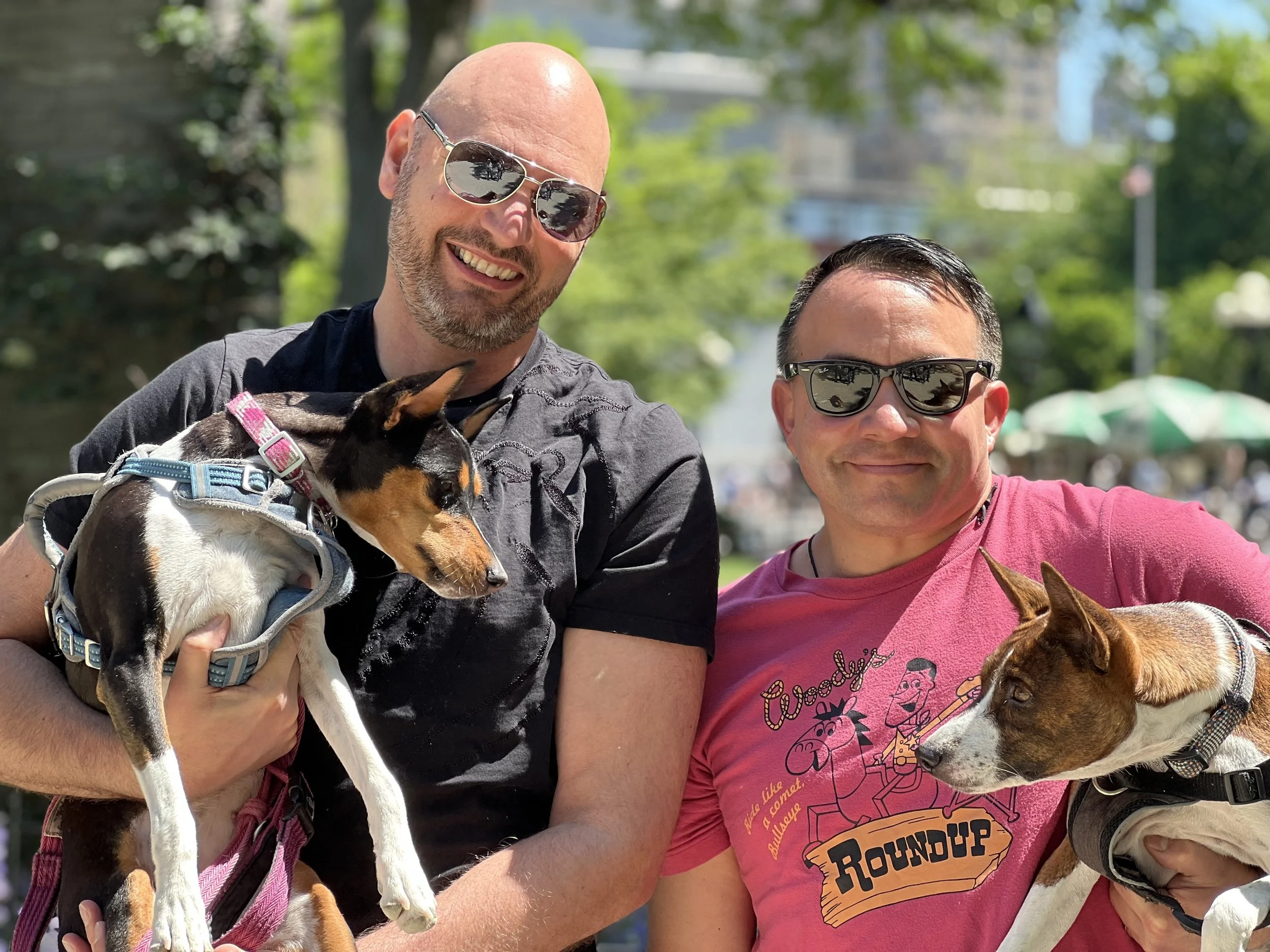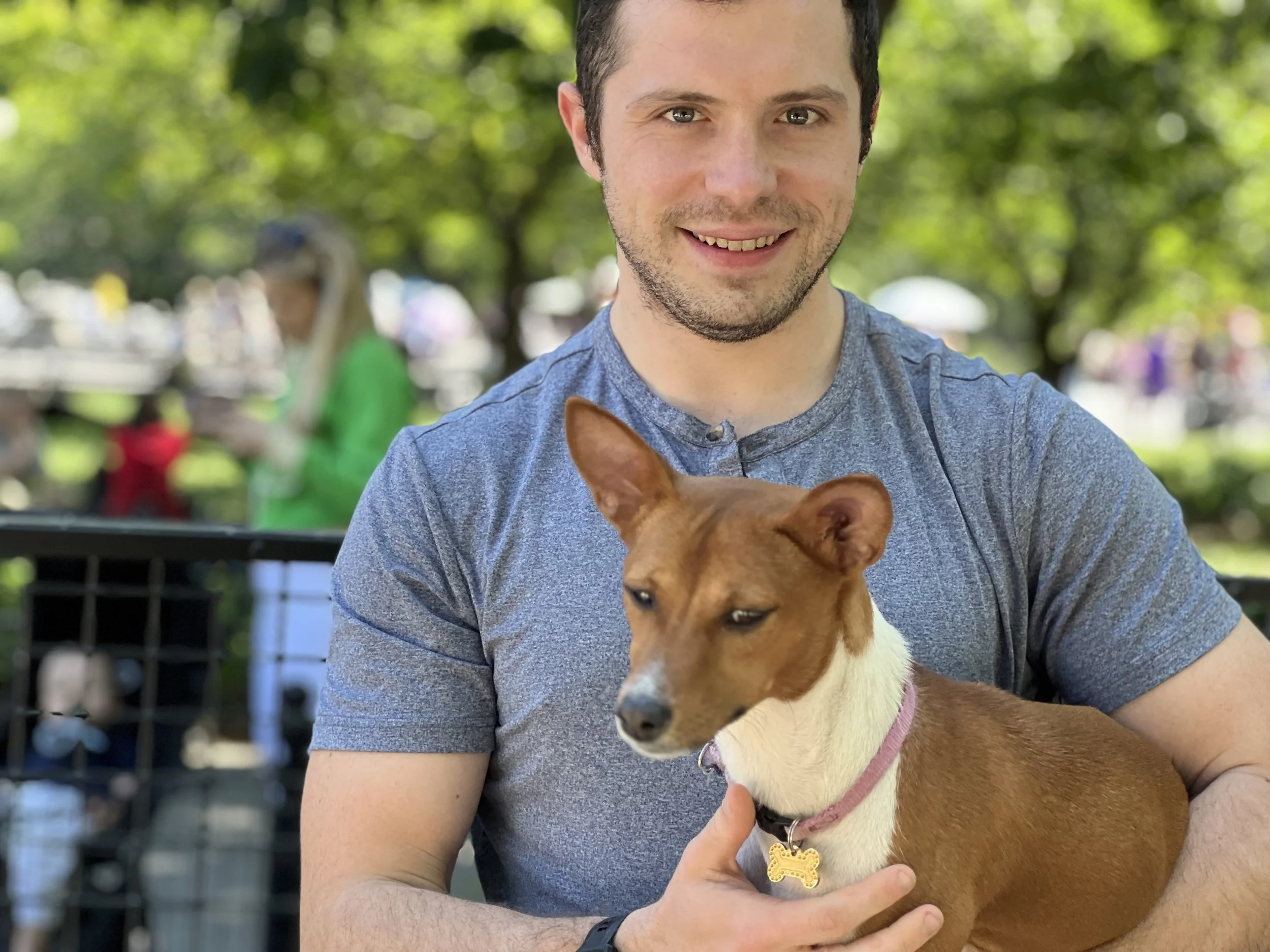Seven basenjis gathered on a beautiful Mother’s Day morning in New York City’s Washington Square Park. No premieres today. The veterans were newcomer puppy Arnold (male, five-months-old,) Roo (female, yearling,) Pepper (female, two-years-old,) housemates Lulu (female, two-years-old,) and Dexter (male, two-years-old,) Dante (male, five-years-old,) and Kepler (male, eight-years-old.) Starting temperature: 65°F|18.3°C