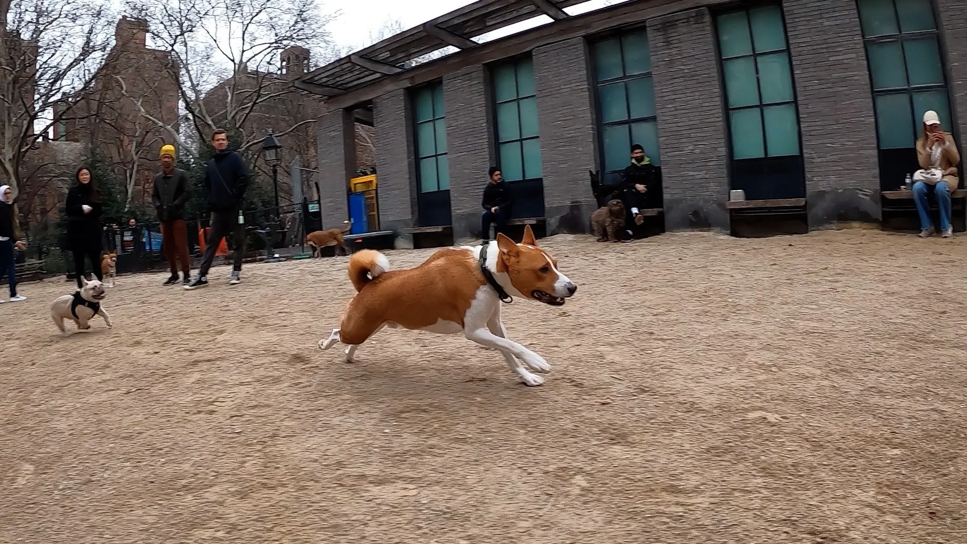 Four basenjis gathered on a gray December morning in Washington Square Park in New York City. Making his first visit was Kikko (male, four-years-old.) He was a sparkplug for much of the running. He was joined by Boulder (male, soon to be one-year-old,) Gaia (female, two-years-old,) and Kepler (male, nine-years-old.) Starting temperature: 50°F|10°C
