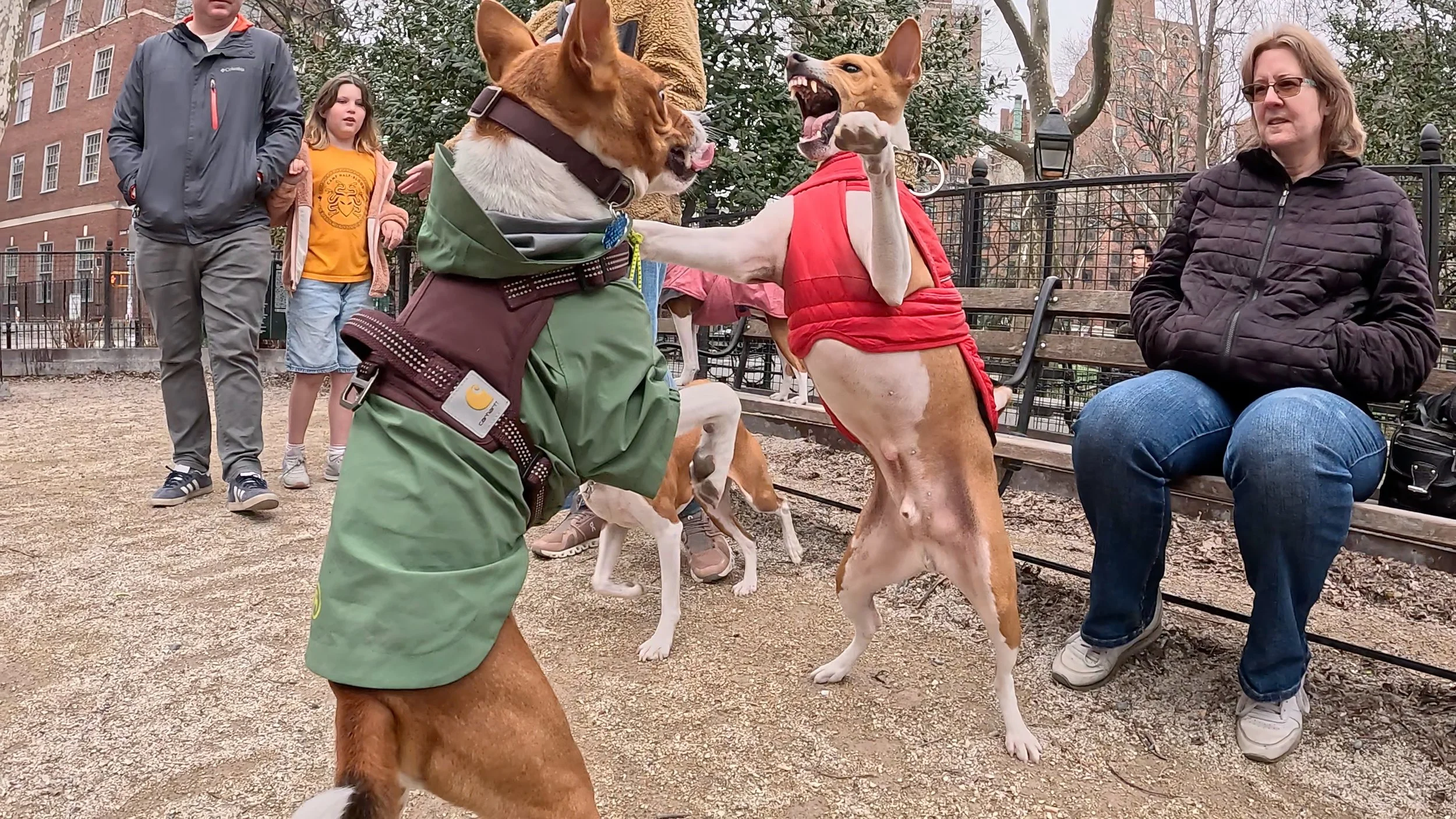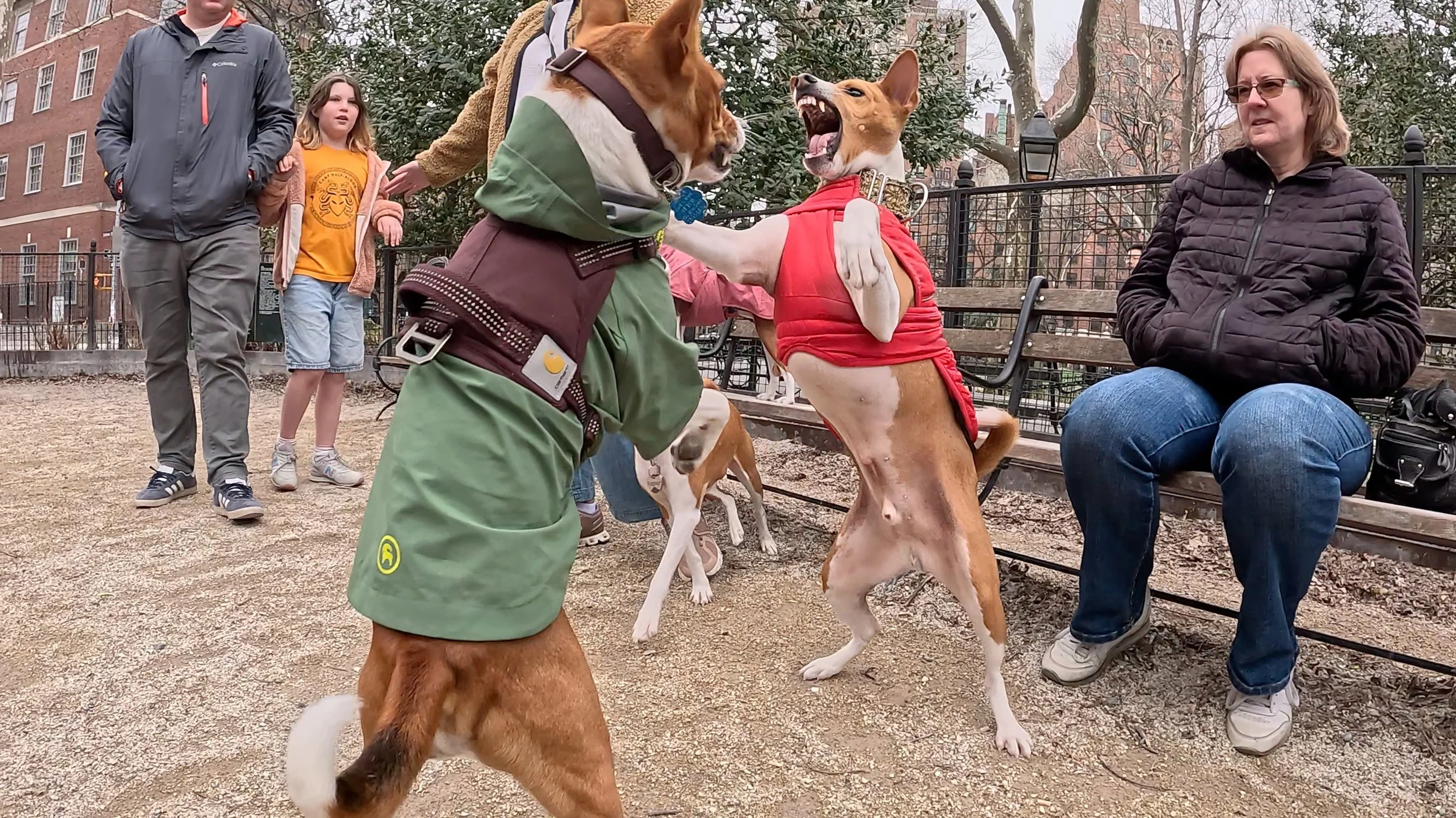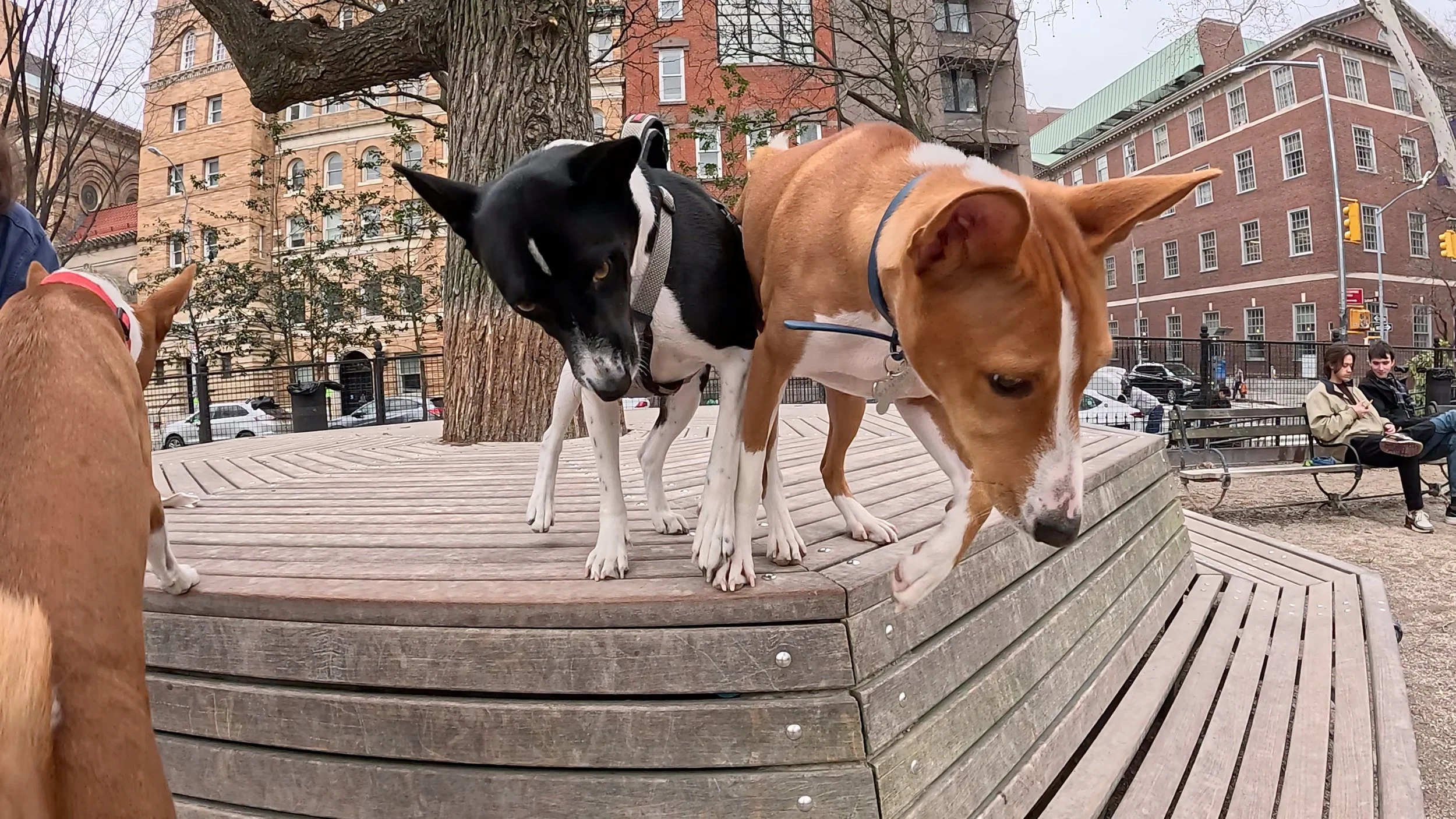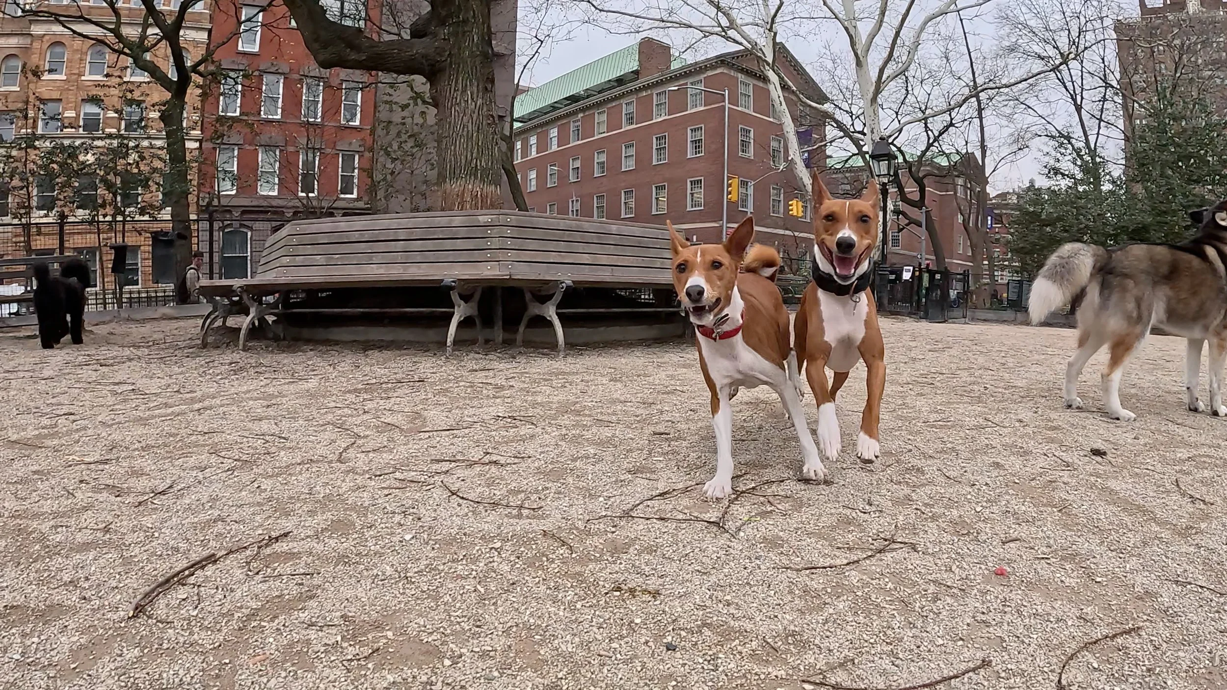 Two three-year-old male basenjis were the spark plugs on an action-packed morning in Washington Square Park, New York City. First-timer Lucas ran and rans, and inspired veteran Kepler to chase and hump him. Fawkes, making a return visit, led several chases and a couple of tussles with Rocket. Mia was the senior female, and Bella Luna the junior. She showed that in spite of her small size she could knock tallest male Oscar off the bench.
