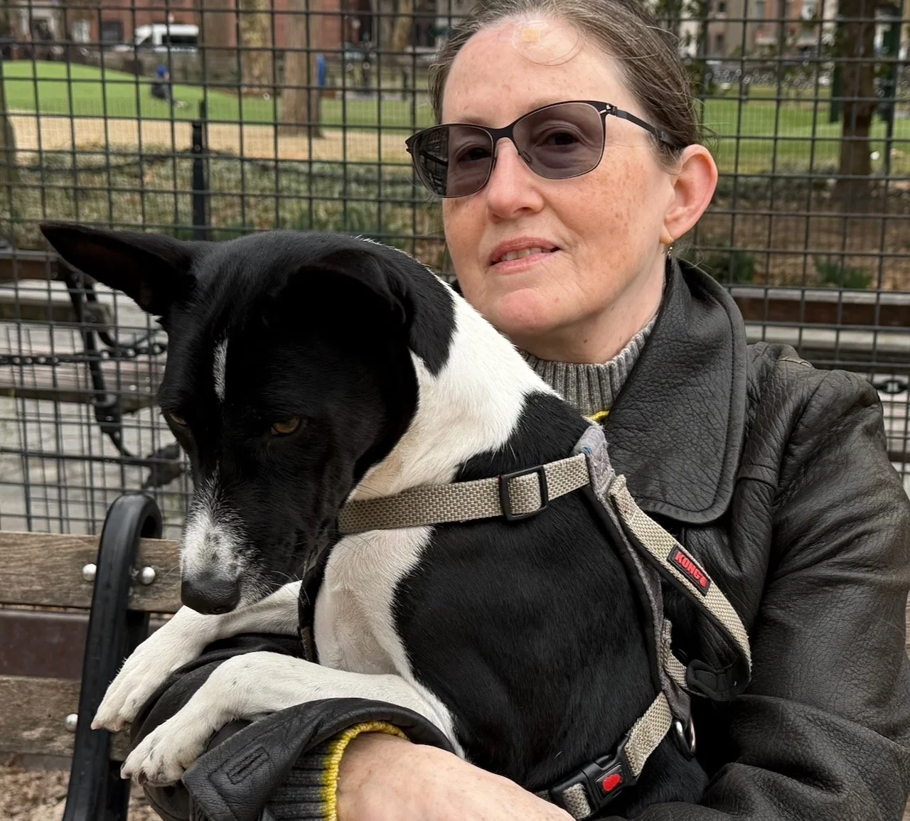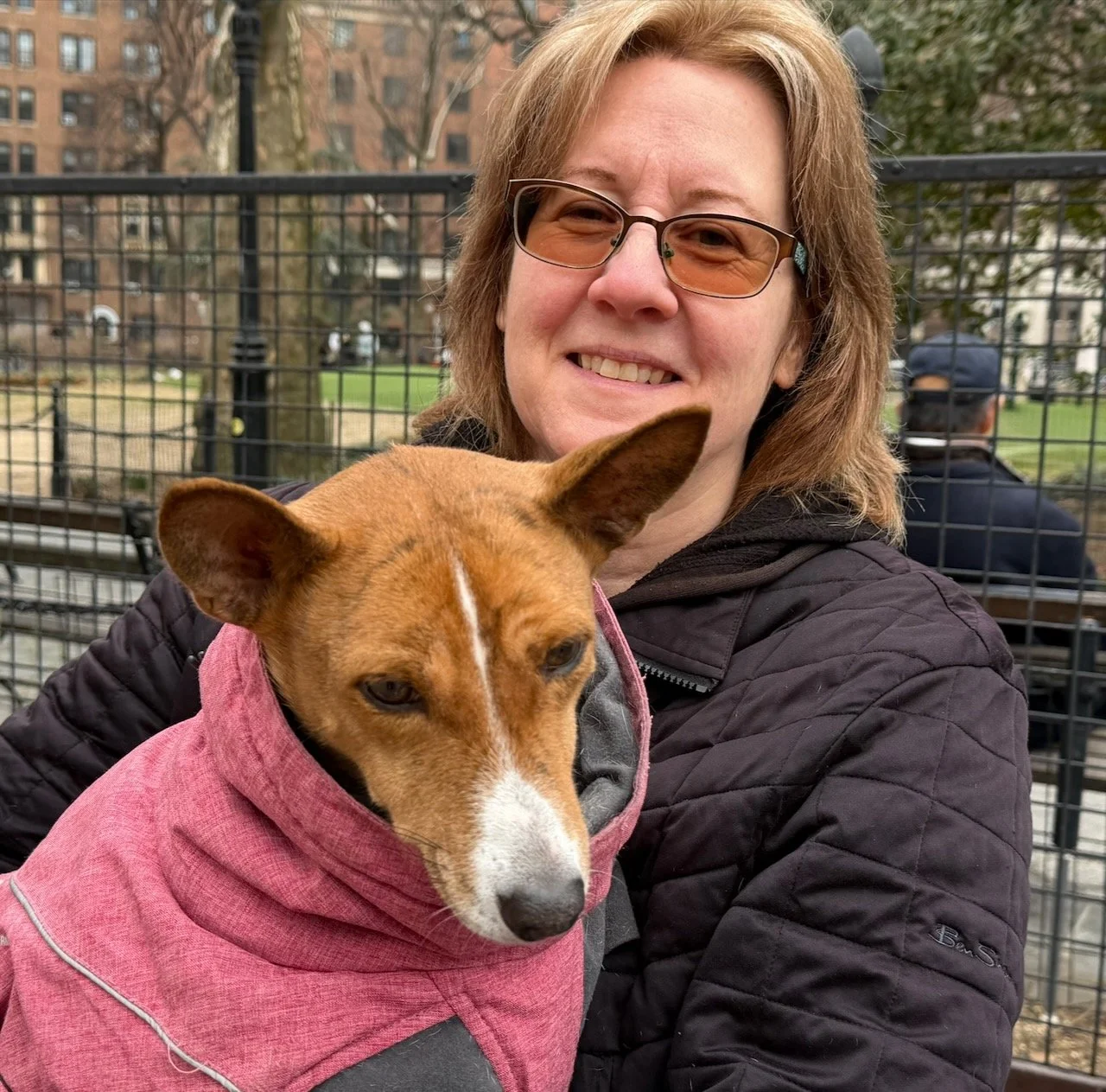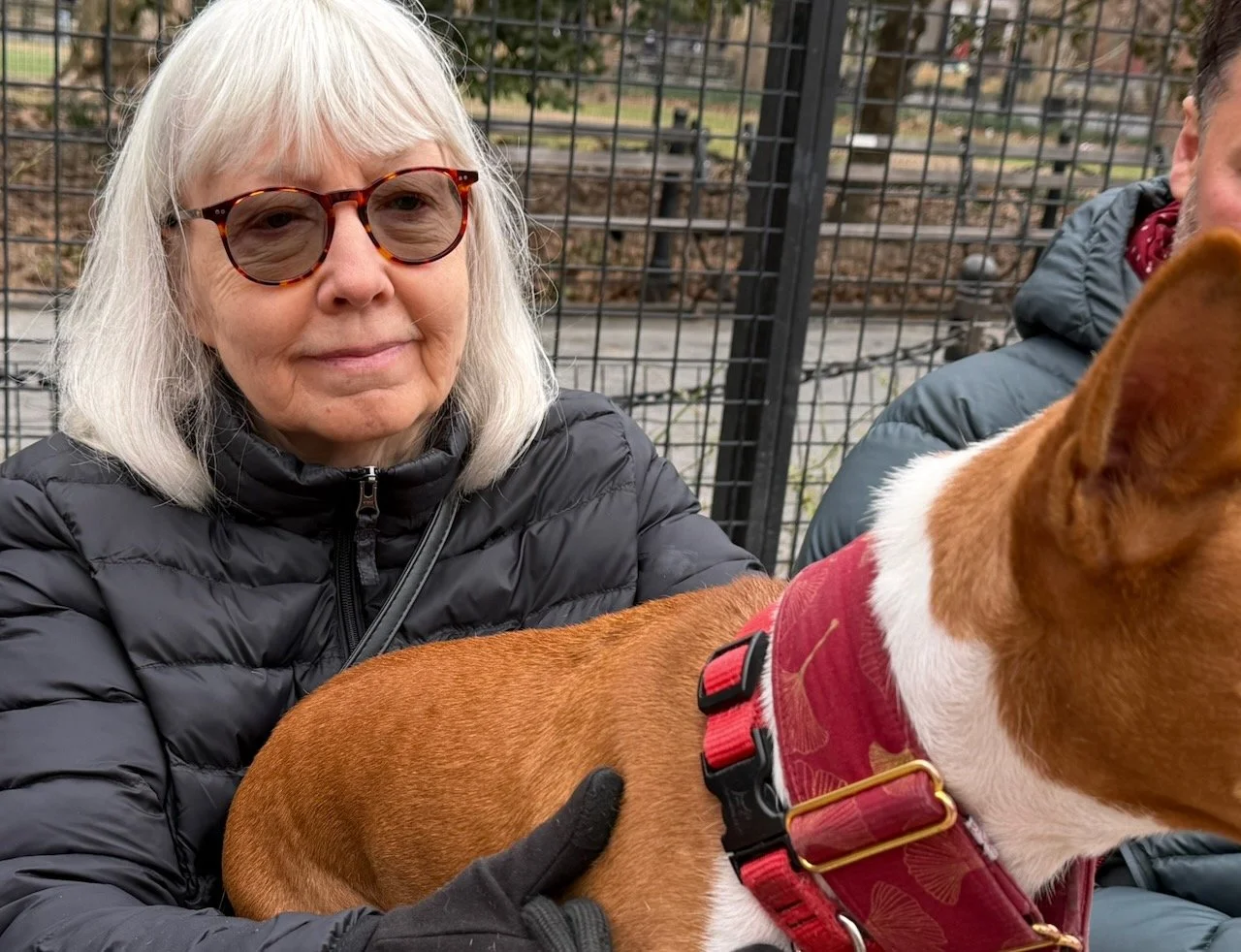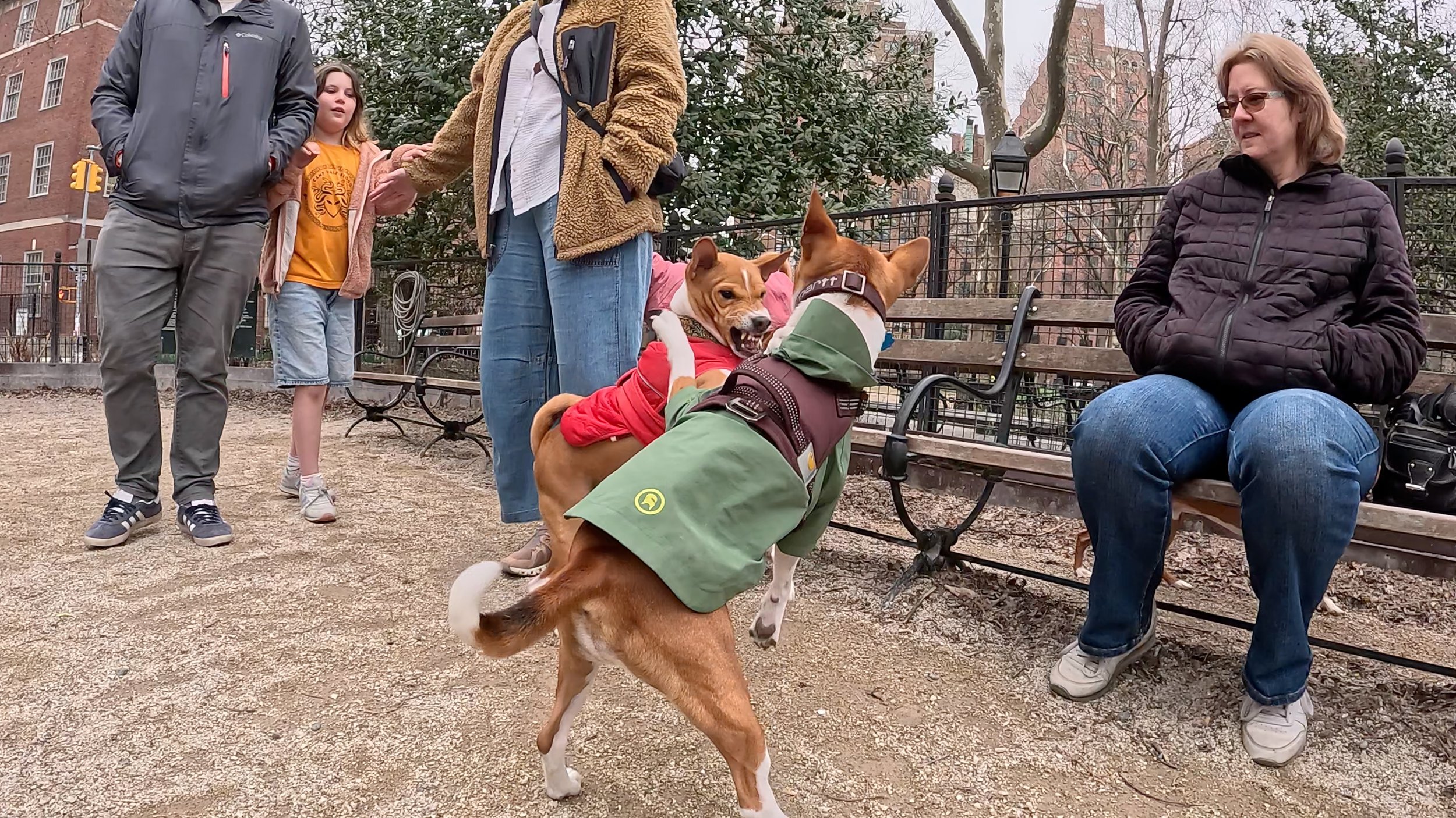 Two three-year-old male basenjis were the spark plugs on an action-packed morning in Washington Square Park, New York City. First-timer Lucas ran and rans, and inspired veteran Kepler to chase and hump him. Fawkes, making a return visit, led several chases and a couple of tussles with Rocket. Mia was the senior female, and Bella Luna the junior. She showed that in spite of her small size she could knock tallest male Oscar off the bench.
