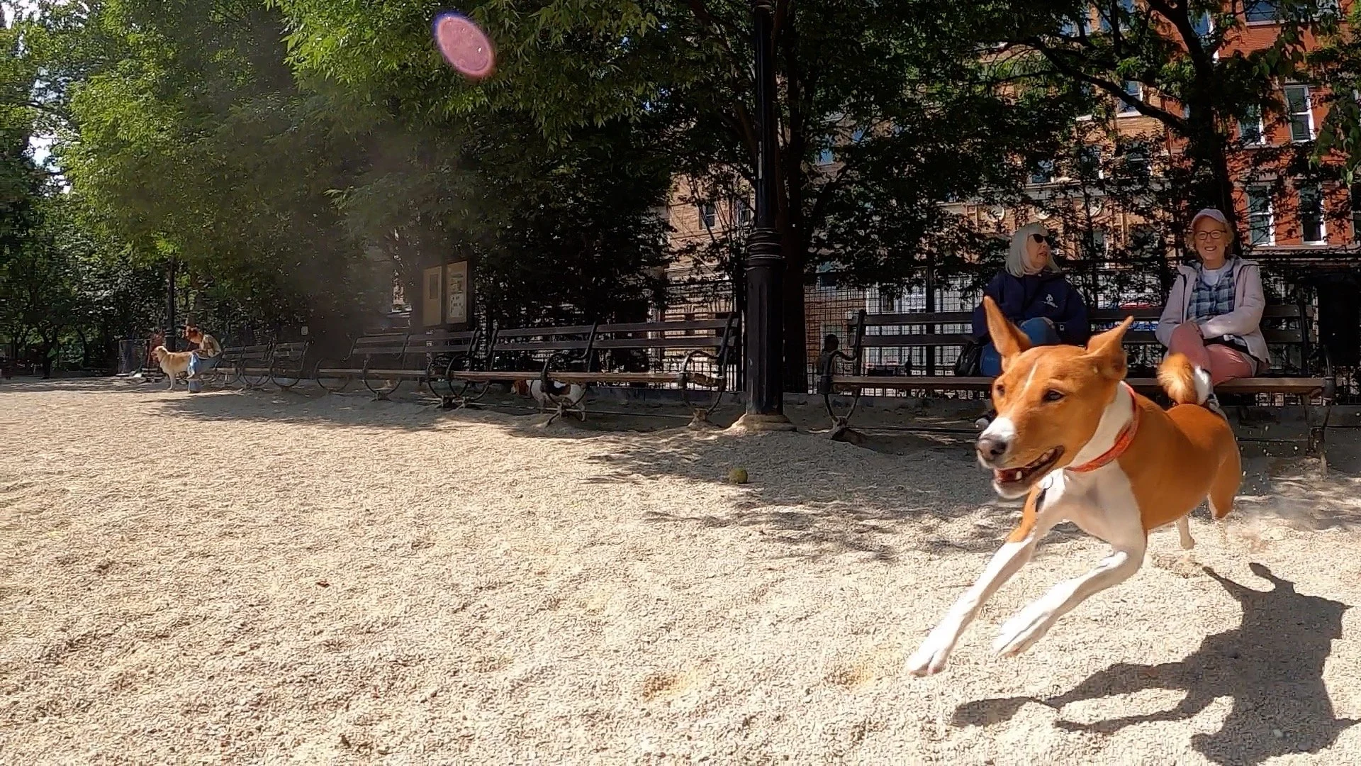 Eight basenjis gathered on another beautiful spring morning in New York City’s Washington Square Park. (Before the arrival of Canadian-fire air degradation.) The action started with Kepler (male, eight-years-old,) trying to catch Meadow (female, two-years-old.) Meadow then shows the full extent of her running prowess with an extended run around the park and away from many dogs. Next we see Fawkes (male, yearling,) take on two other dogs in an impressive run/tussle event. We explore the tri-colored dogs on hand: Uni (female, yearling,) Dante (male, five-years-old,) Diffa (male, trindle, five-years-old,) and Malcolm (male, eight-years-old.) We conclude with Apollo (male, eight-years-old,) who may be Malcolm’s littermate. Starting temperature: 59°F|15°C