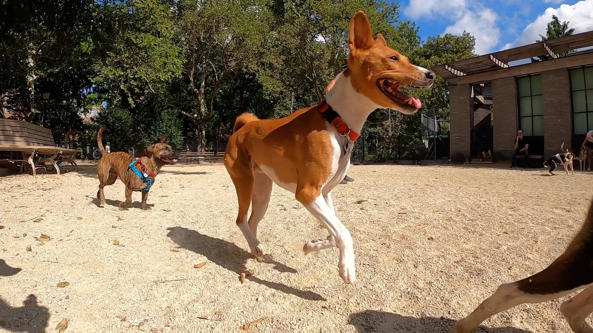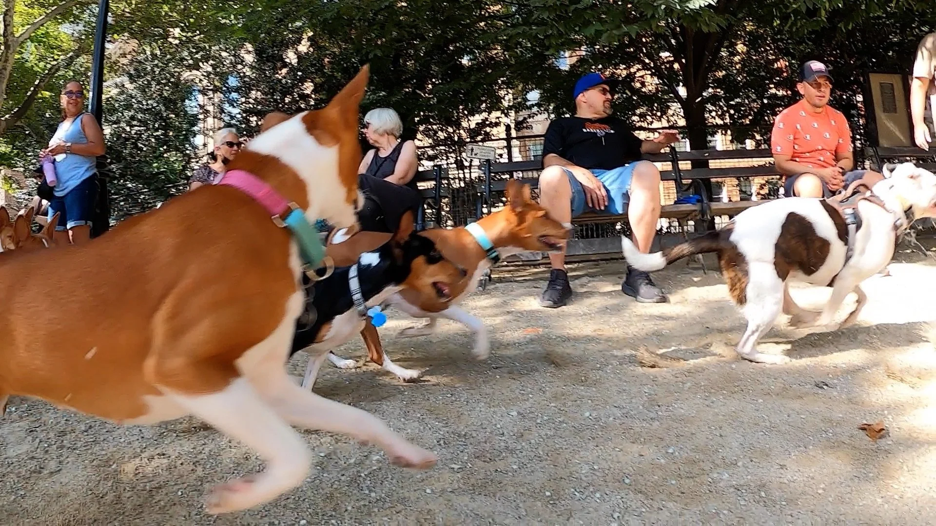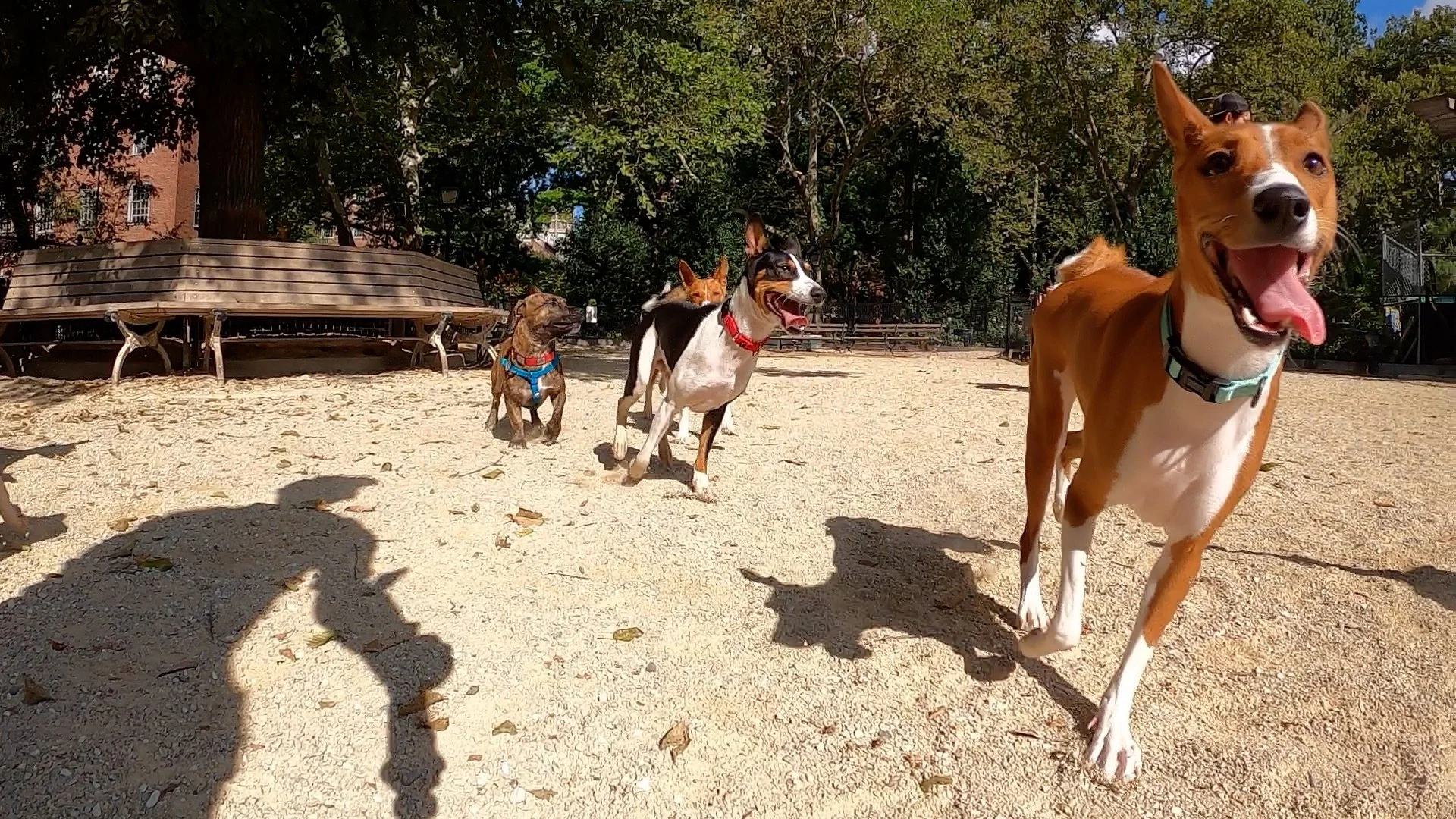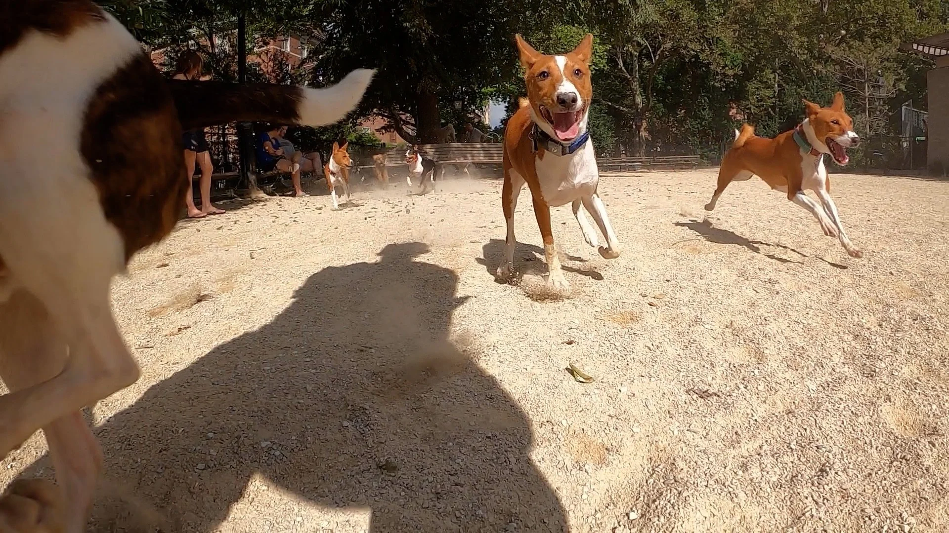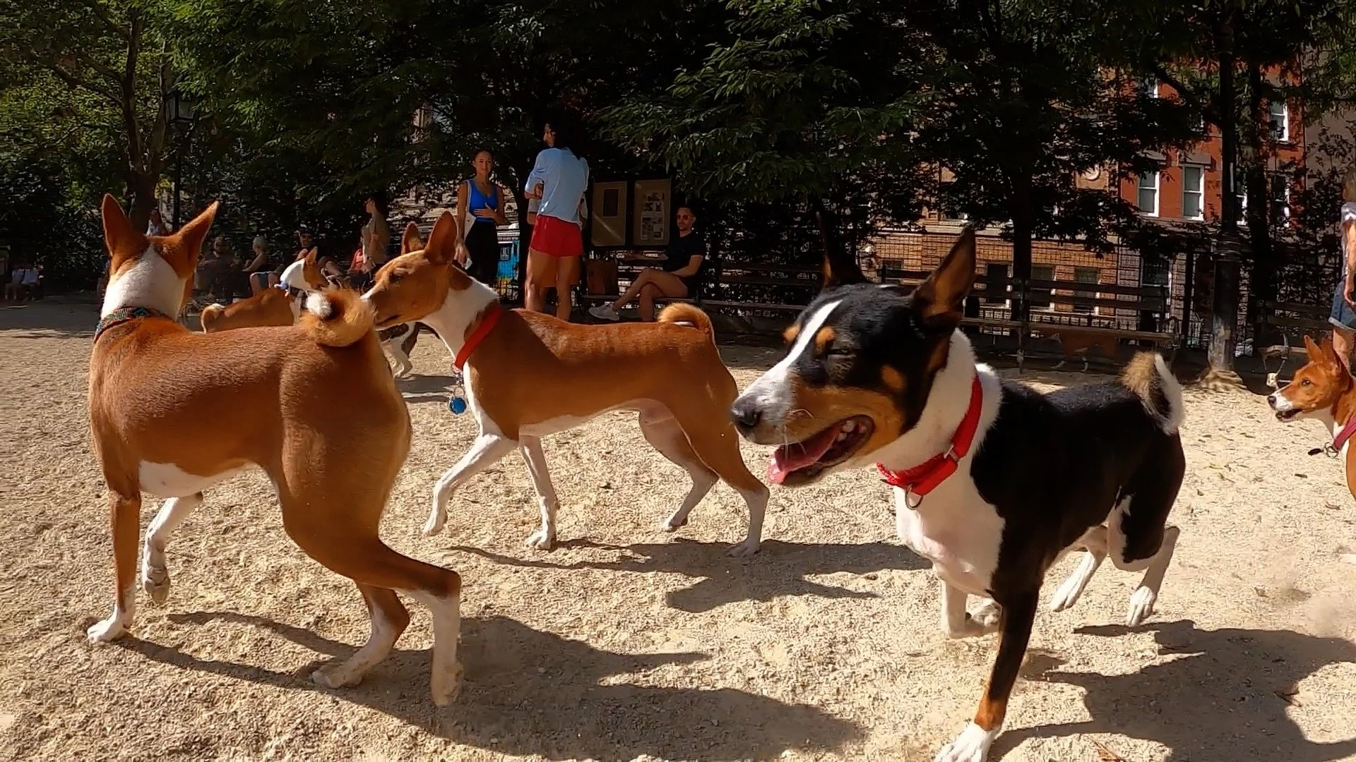 With an early start to meet the oppressive heat nine basenjis came to run in Washington Square Park in New York City. Today’s featured dogs are two first-timers, puppy Roxy (female, six-months-old,) and Ruby (female, yearling.) Roxy is from just upstate (Putnam county) and Ruby is from very far upstate (Toronto, Canada.) The others running in the heat were Kobe (male, eight-months-old,) and yearlings G.G. (female,) and Oliver (male.) The young adults were two-year-olds Dante (male,) and Willow (female.) The adults were Dante (tri-male, four-years-old,) and Kepler (male, eight-years-old.) Starting temperature: 80°F|26.7°C