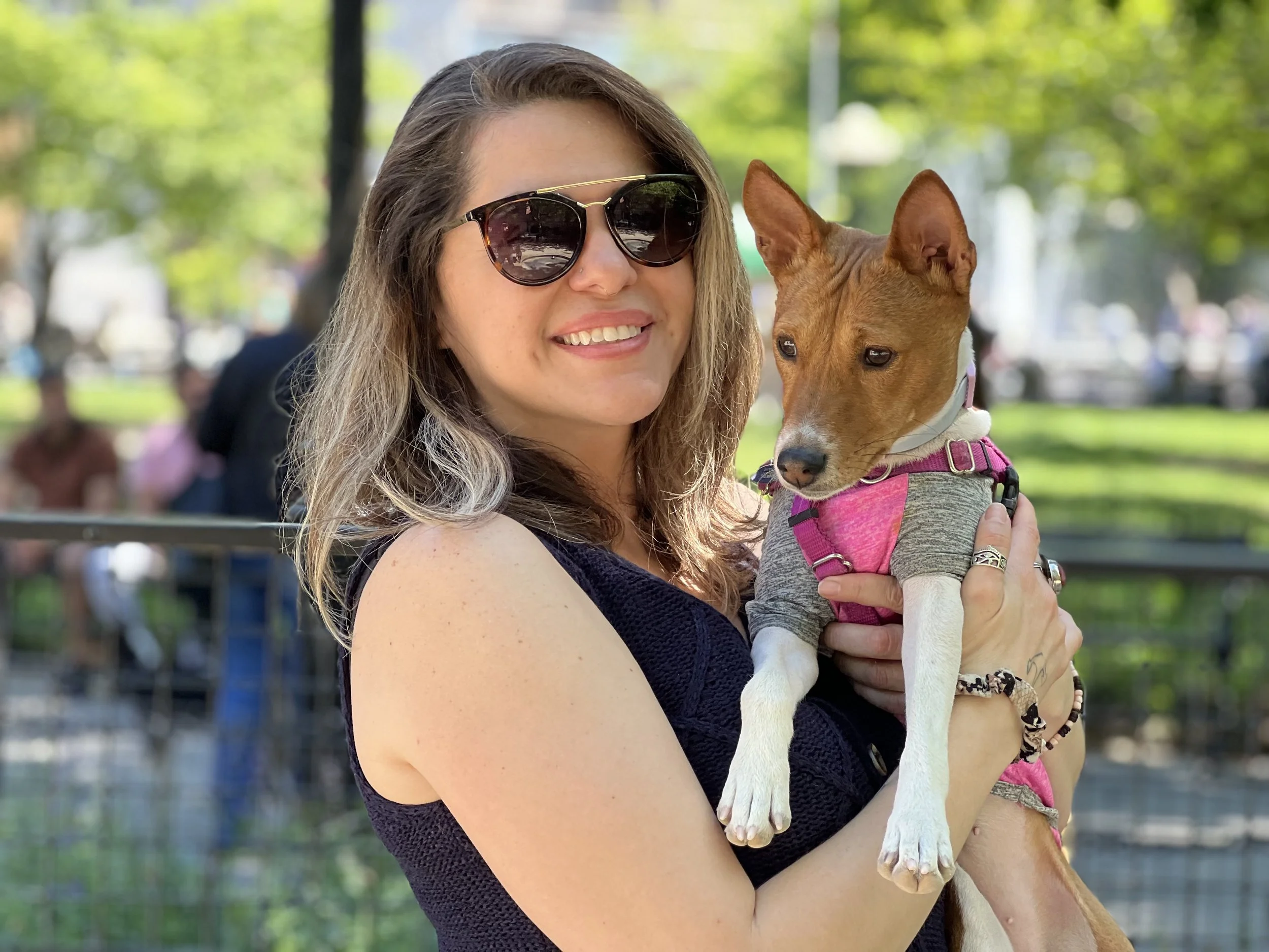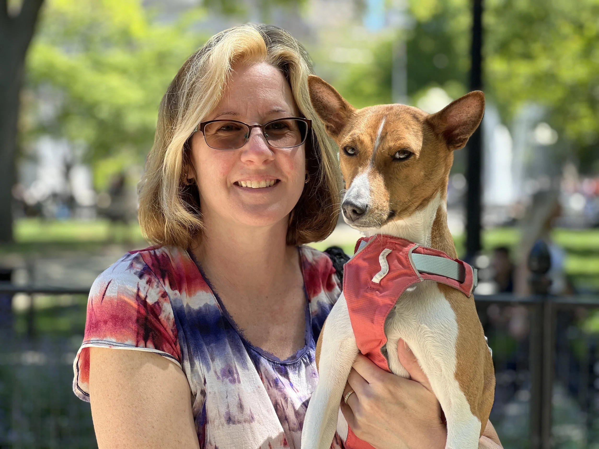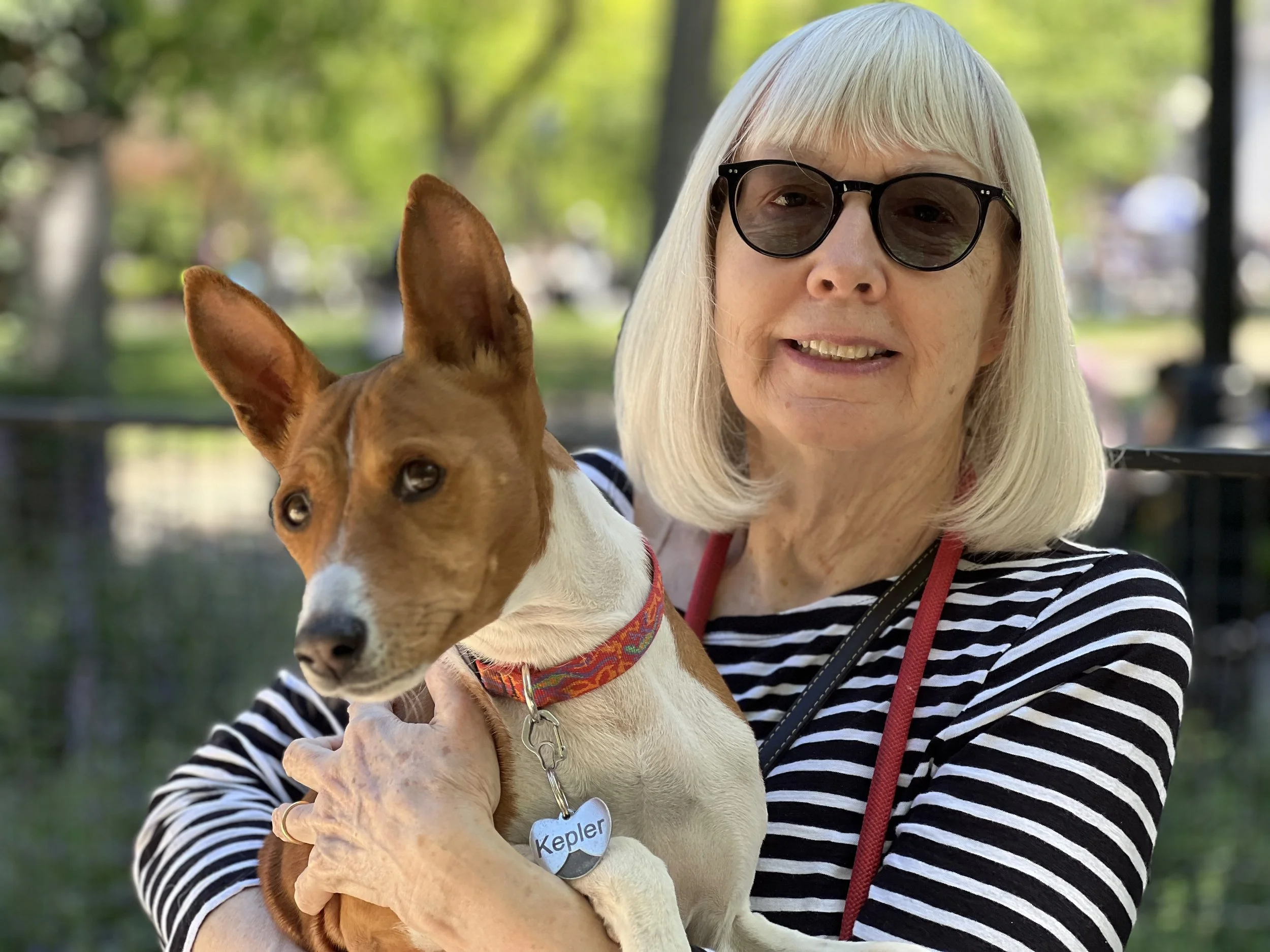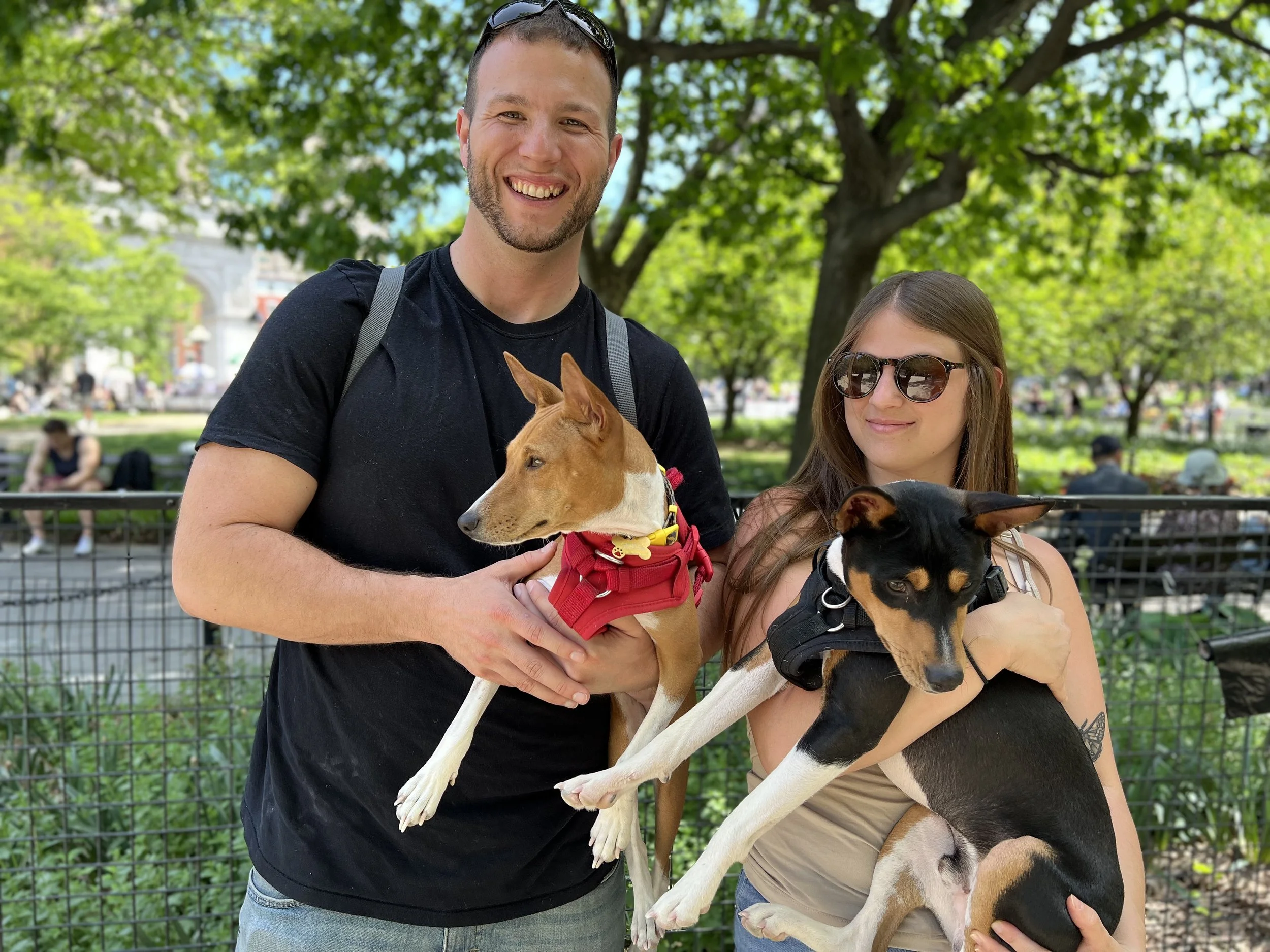 The first weekend in May brought beautiful sunny weather, one dozen basenjis, and the premiere of puppy Hudson. There was lots of action in New York City’s Washington Square Park. Hudson (male, five-months-old,) came with his housemate Harper (female, ten-years-old, today’s senior.) They were joined by puppy Arnold (male, four-months-old,) Revolver (male, eleven-months-old,) with housemate Abbey (female, two-years-old,) Gaia (female, yearling,) Uni (female, yearling,) Zuri (female, two-years-old,) with housemate Zion (male, three-years-old,) Mia (female, six-years-old,) and Kepler (male, eight-years-old.) Starting temperature: 65°F|18.3°C